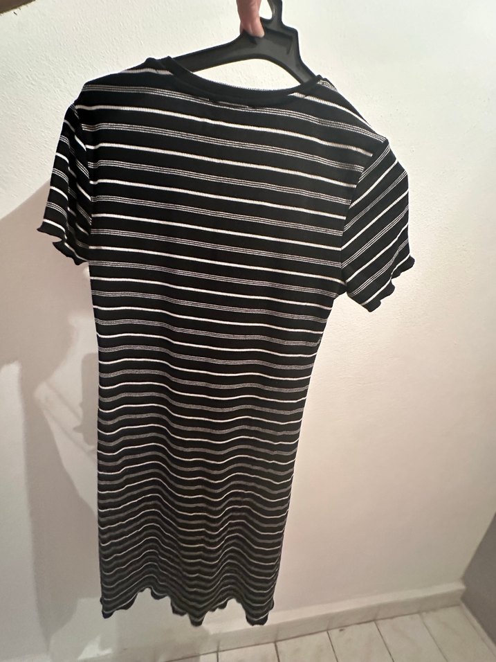 Kısa kollu, tekne yaka, çizgili siyah ve gri midi elbise. Sentetik kumaştan, pilili detaylı, günlük kullanıma uygun.