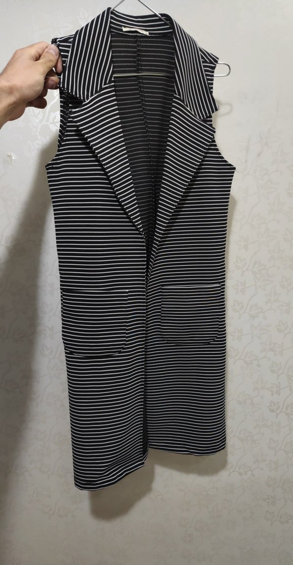 Düğmesiz, önü açık. Önünde 2 adet cebi vardır. Siyah ve gri çizgili, kolsuz midi yelek. Normal kesim, kesik yakalı. Minimalist ve trend görünümlü.
