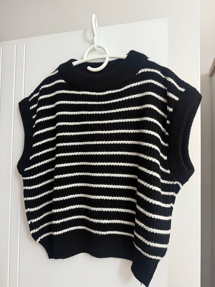 Yuvarlak yaka, kolsuz, bol kesim örgü süveter. Siyah ve gri çizgili deseniyle rahat ve trend bir gündelik stil sunar.