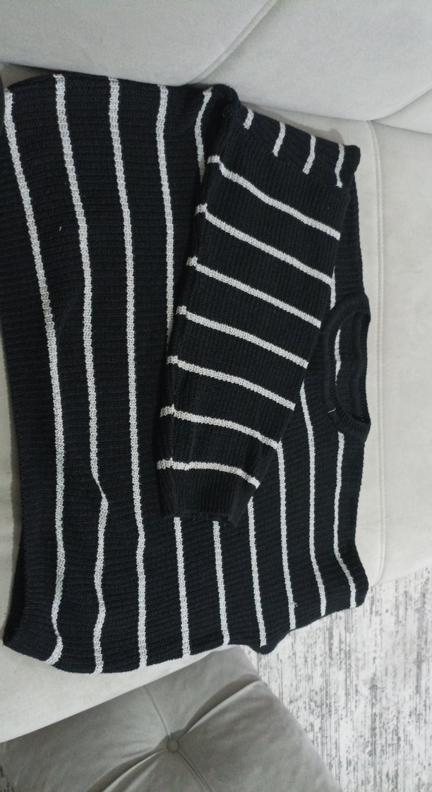 Çizgili siyah ve gri renkte, uzun kollu, triko kadın kazak. Salaş kesimi ve kayık yaka detayı ile rahat ve şık bir günlük tercih.rwngi biraz solgun