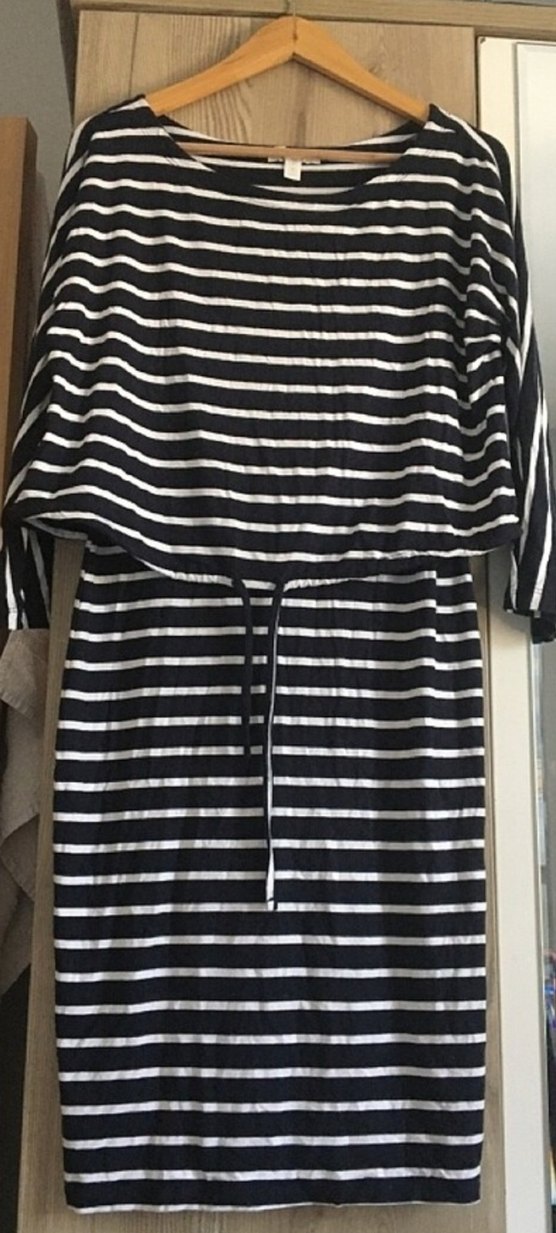Siyah çizgili günlük elbisesi, bol kesim, kuşaklı, kayık yaka ve ince askılıdır. Günlük kullanıma uygun, yumuşak Viskoz kumaştan üretilmiştir. yeni ve sıkıntısiz..