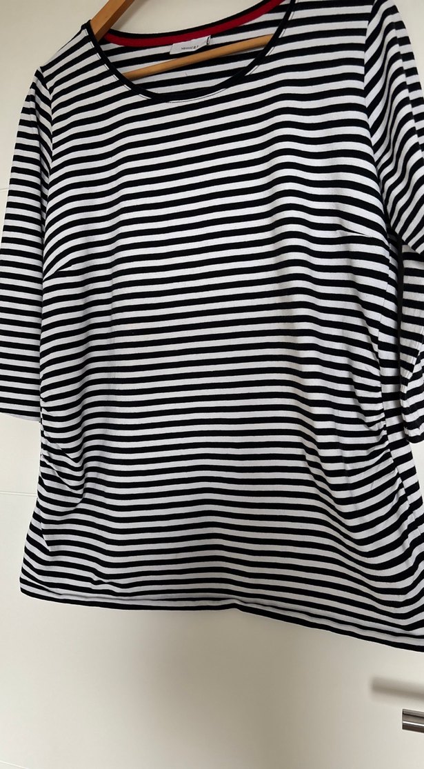 V yaka, kısa kollu, bol kesim siyah-beyaz çizgili hamile tişörtü. Pilili detayları ve konforlu sentetik kumaşıyla günlük kullanıma uygundur.