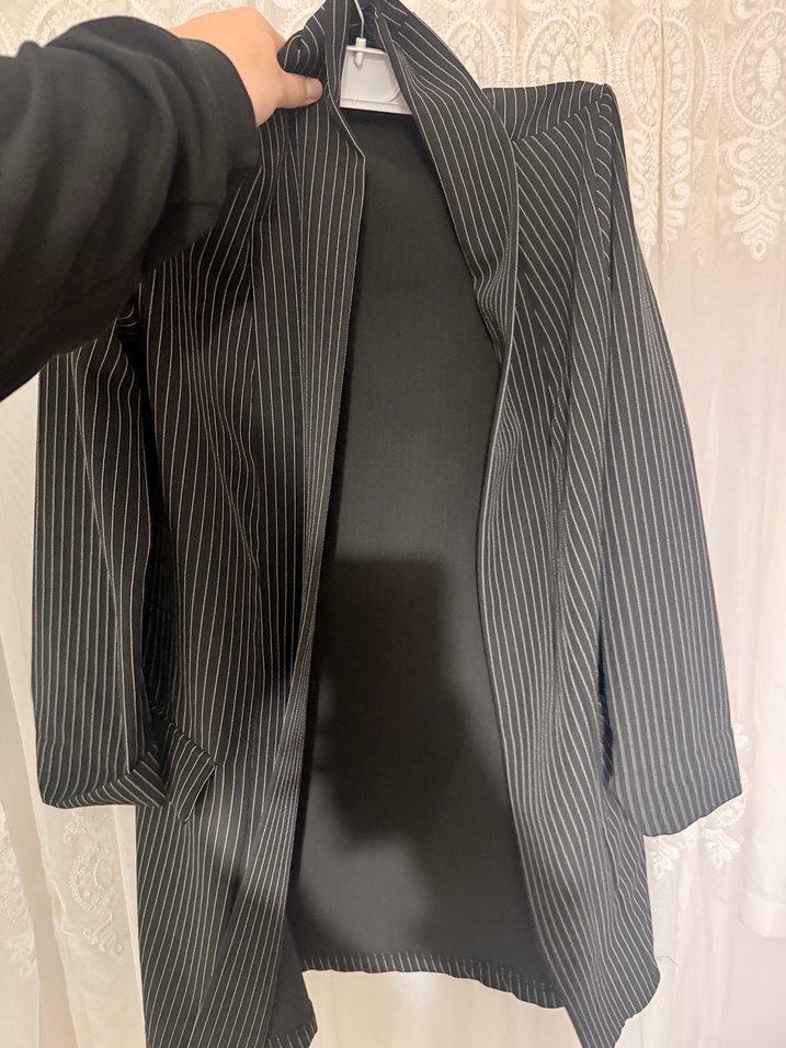 Çizgili siyah blazer, kesik yaka ve uzun kolludur. Normal kesim ve pileli detaylara sahiptir, midi boyda ve iş ile günlük kullanıma uygundur.