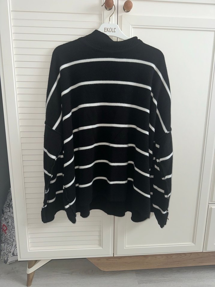 Çizgili beyaz detaylı, uzun kollu, boğazlı siyah triko kazak. Rahat kesimi ve midi boyuyla günlük sokak stili için uygundur.
