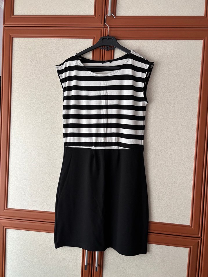 Kolsuz, siyah ve beyaz çizgili üst kısmı ile düz siyah etekten oluşan, sentetik kumaştan yapılmış, vücuda oturan mini elbise.