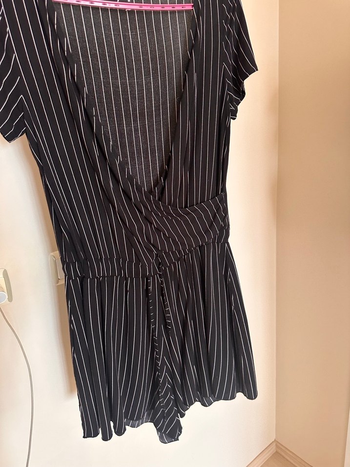 V yaka ve ince askılı kısa kollu, siyah çizgili mini tulum. Pliseli tasarımı ve rahat sentetik kumaşıyla günlük kullanıma uygun, trend bir parça.