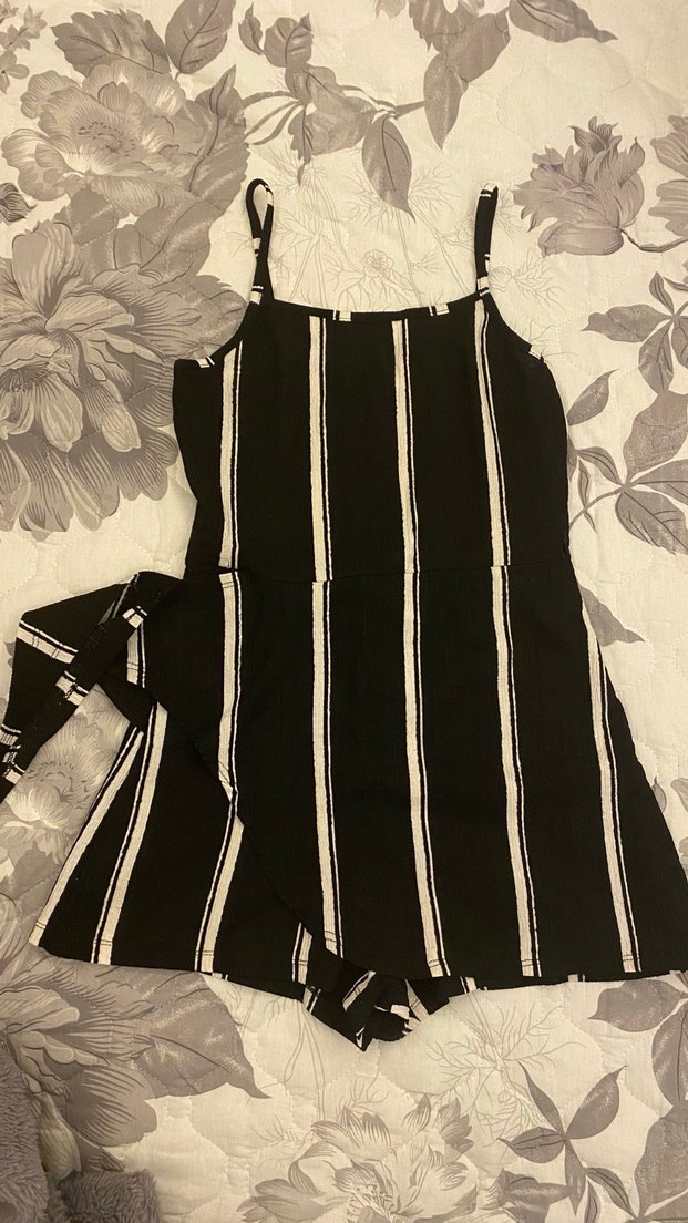 İnce askılı, kayık yakalı siyah mini tulum. Dikey çizgili, belden bağlamalı ve vücuda oturan kesim, sentetik kumaştan, günlük sokak stiline uygun.Şort eteklidir .