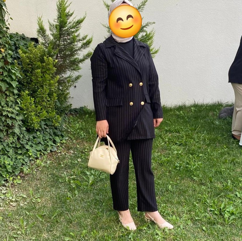 Bir gün davette giyilmiştir XL bedendir.Çizgili desenli, notched lapel yakalı, düğmeli siyah kadın ofis takımı. Midi uzunlukta ve regular fit kesime sahiptir, şık ve rahat bir iş kıyafeti sunar.