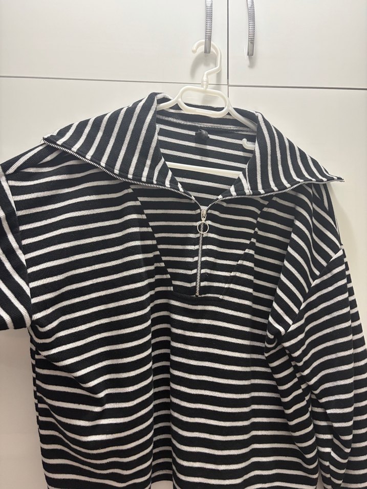 Uzun kollu, yakalı ve önden fermuarlı siyah kadın sweatshirt. Rahat kesimli, çizgili desende, sentetik kumaştan günlük kullanıma uygun. Bol kesim ve rahat kumaştır daha büyük bedenlerede olucaktır.