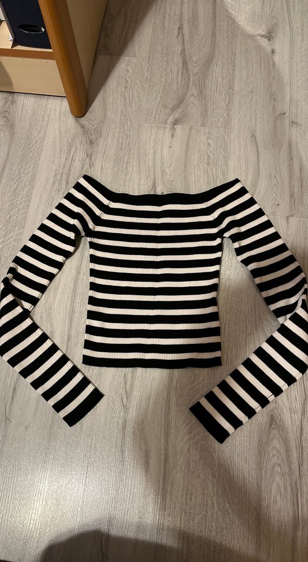 Uzun kollu, kayık yaka, çizgili siyah beyaz triko kadın bluz. Bana biraz dar geliyor o yüzden hiç giyemedim, iade süresi geçtiğinden iade de edememiştim. Hiçbir sorunu yok sıfır ürün. Bence daha çok xs-s beden için uygun.