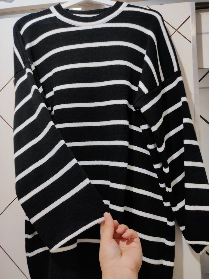 Uzun kollu, yuvarlak yakalı, bol kesim kadın triko kazak. Siyah beyaz çizgili, sentetik kumaştan örülmüş, günlük sokak stiline uygun.
