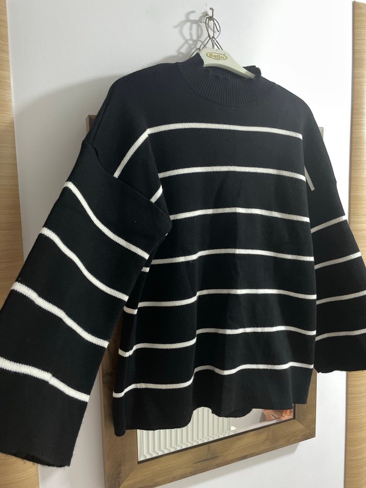 Beyaz yatay çizgili siyah triko kazak, bisiklet yaka ve uzun kollu. Bol kesim ve normal boyda, rahat sokak stili için uygun.