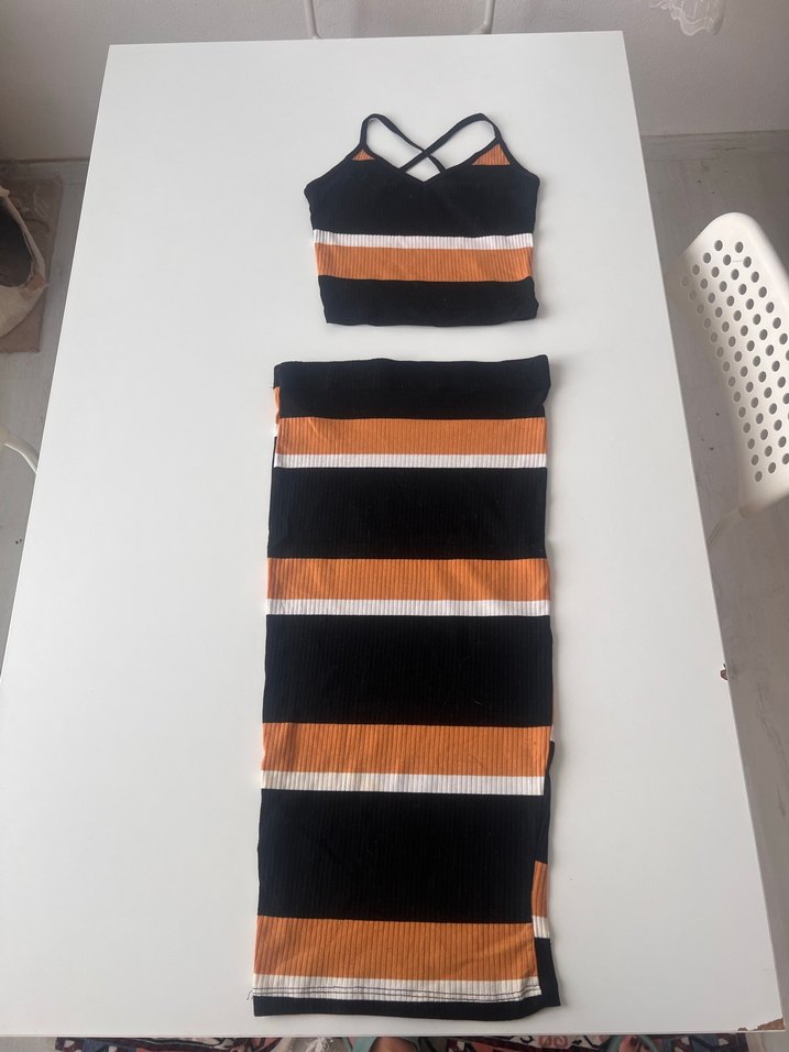 Uzun, oturan kesim siyah kadın triko etek bluz, turuncu ve beyaz çizgili pile detaylı. Askılı ve straplez yakalı, günlük rahat stil için uygun.