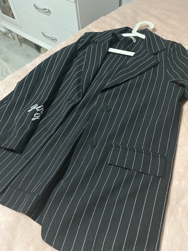 Çizgili siyah kadın blazer, düğmeli ve kesimli yakalıdır. Uzun kollu, uzun boylu ve sentetik kumaştan üretilmiştir