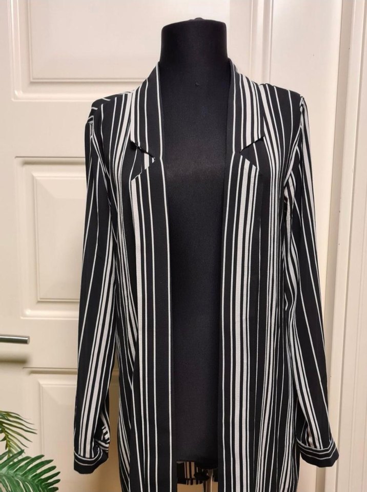 Temiz, sorunsuzdur. Mevsimlik, bluz ya da atlet üzeri giyebileceğiniz astarsız ince ceket. Basene kadar uzanıyor. #ceket #mevsimlik #çizgili #hırka Çizgili desenli siyah kadın blazer, kesimli yaka ve uzun kolludur. Sentetik kumaştan, regular fit ve uzun boyda, ofis için uygundur.