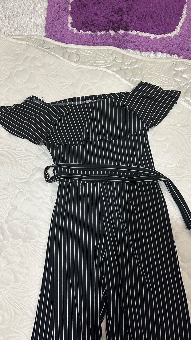 Uzun, çizgili siyah tulum, tekne yakalı ve askılı kolludur. Kemer detaylı, şık ve rahat sokak stiline uygundur.