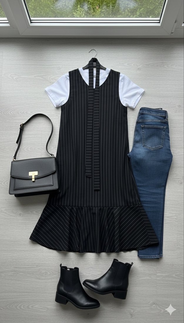 Siyah, çizgili desenli, kemerli jile elbise. Denim kumaştan, regular fit, askılı kollu ve bisiklet yakalıdır. Günlük kullanım için uygundur.