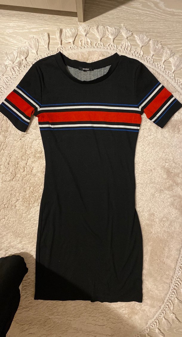 Siyah zemin üzerine kırmızı, mavi ve beyaz çizgilerle kısa kollu, elastik kumaştan, midi boy ve dar kesim elbise. Günlük rahat stil için uygundur. Az kullanildi hicbir defosu yoktur.