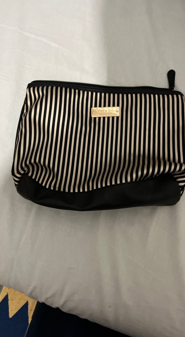 Çizgili desende, fermuarlı siyah makyaj çantası. Sentetik kumaştan yapılmış, günlük kullanım için uygun, klasik Paris tarzını yansıtır.