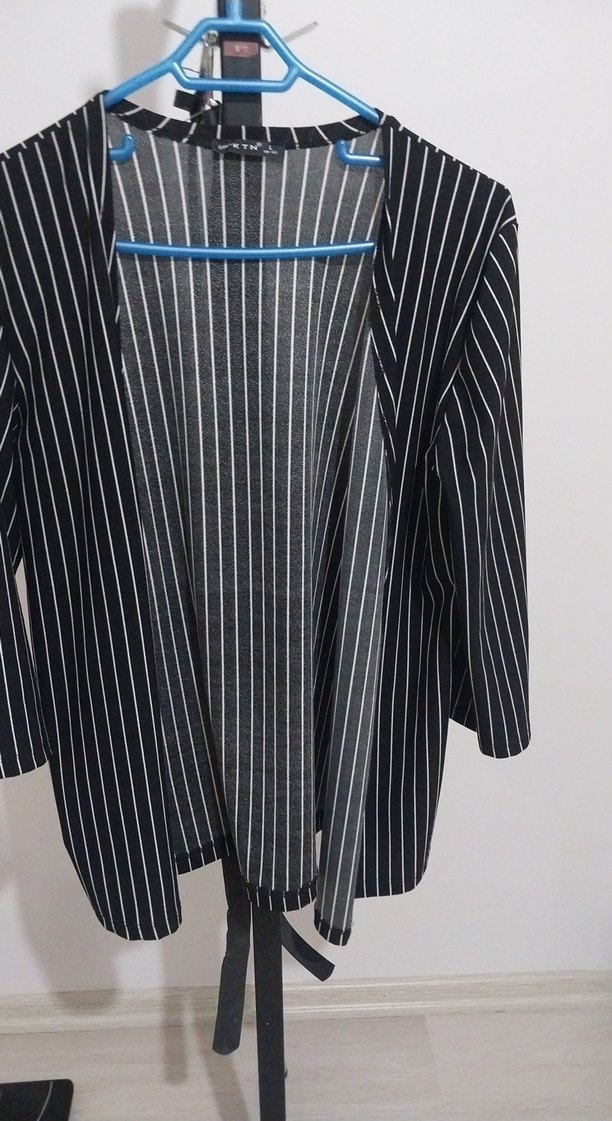 Çizgili siyah midi blazer, kesik yaka ve pile detaylarına sahiptir. Sentetik kumaştan, normal kesim ve askılı kolludur, ofis için uygundur.Esnek kumastır.