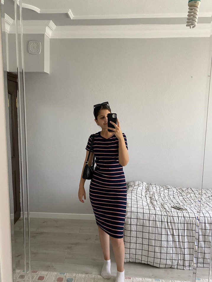 Sentetik kumaştan, kısa kollu, çizgili siyah midi elbise. Günlük rahat ve şık sokak stili için uygundur.