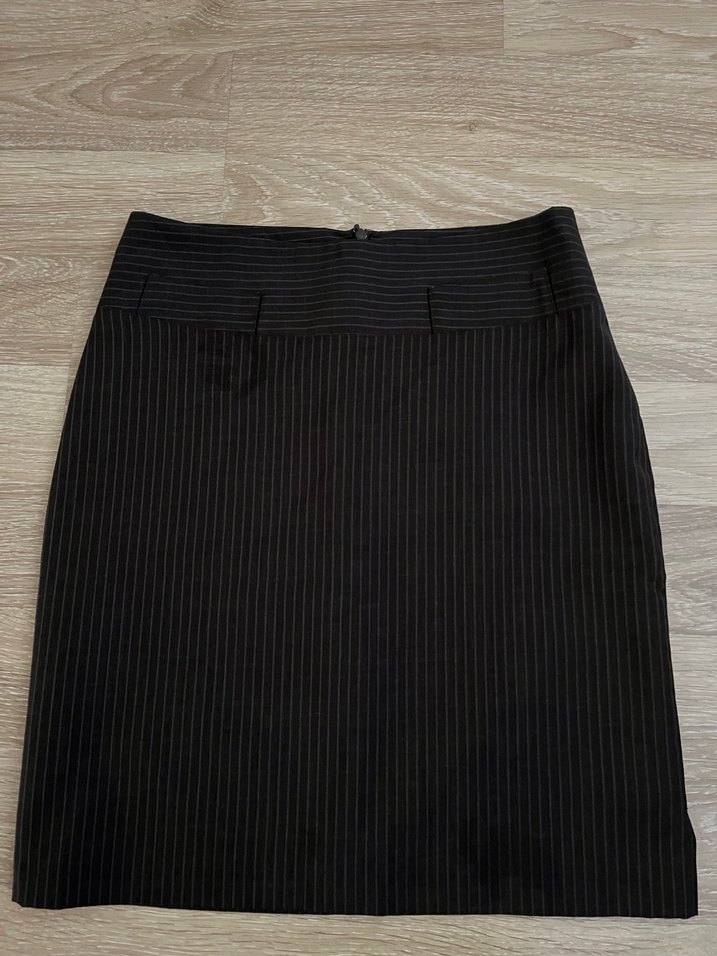Siyah midi kalem etek, çizgili desene ve pile detayına sahip, ofis için uygun sentetik kumaştan yapılmıştır. Ceketini ekliyorum isteyen takım yapabilir