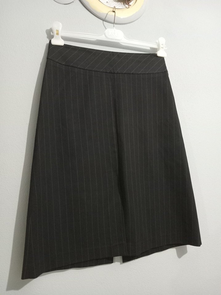 Çizgili desenli, pile detaylı siyah midi kalem etek, sentetik kumaştan, normal kesimdir. Ofis kullanımı için uygundur.