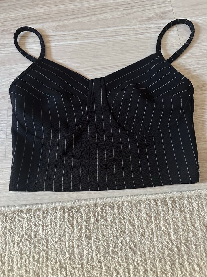 V yaka ve ince askılı, düğmeli ön detaylı siyah çizgili bustiyer. Kısa kesimiyle günlük sokak stiline uyum sağlar. ✨