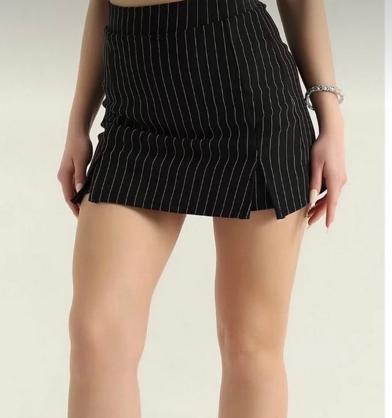 Sentetik kumaştan, çizgili ve pile detaylı siyah mini sort etek,