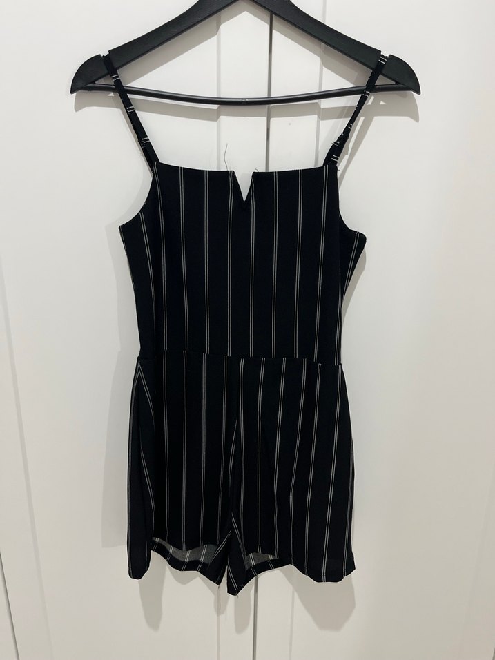 İnce askılı, V yaka ve çizgili desenli siyah mini tulum, pile detaylarıyla romantik akşamlar için uygun. Mrka tensili
