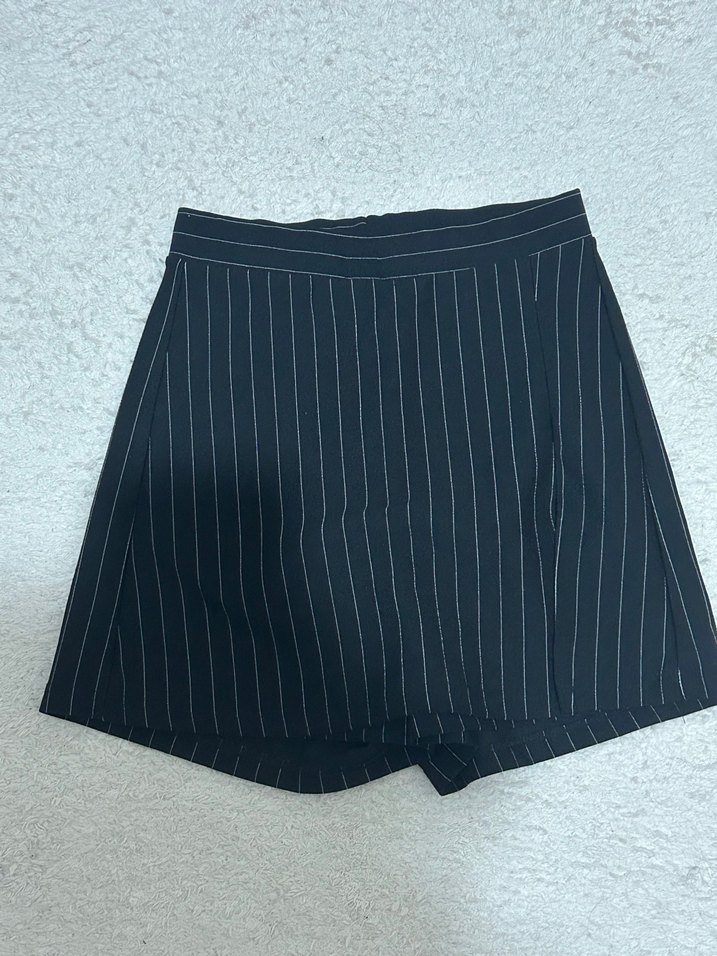 Bu siyah pilili mini etek, ince çizgili deseni ve yumuşak sentetik kumaşıyla trend ve rahat bir görünüm sunar.