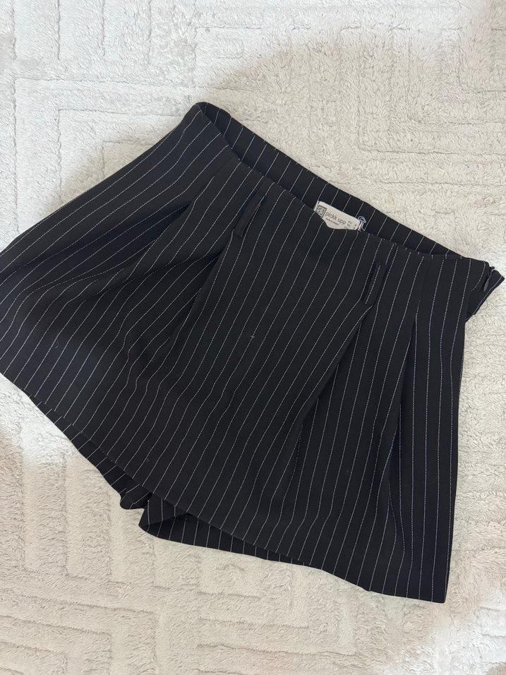 Siyah, sentetik kumaştan yapılmış, pilili ve çizgili, bol kesim mini etek, ofis kullanımı için uygundur.