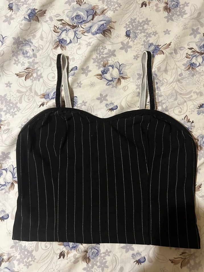 Dikey çizgili, siyah renkli, askısız ve kolsuz, pileli detaylara sahip, vücuda oturan büstiyer. Günlük kullanıma uygundur.