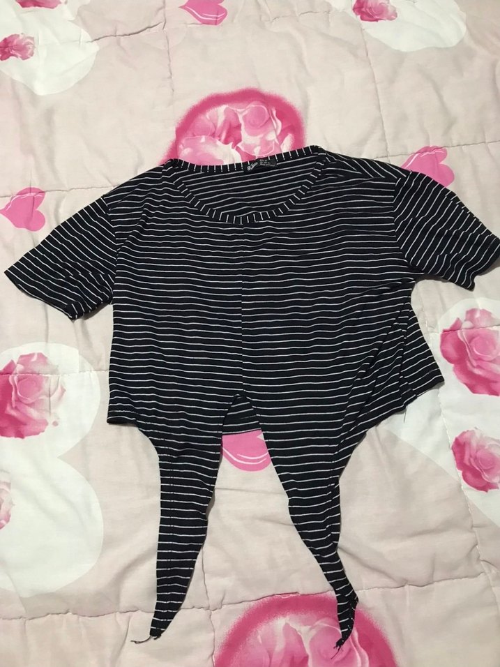 Dar kesim siyah çizgili, kısa kollu ve kayık yaka. Yumuşak sentetik kumaştan, önden bağlama detaylı günlük rahat stil için uygun. m yazıyor ama s bedene olur