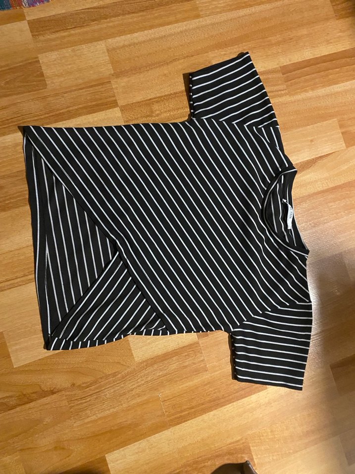 Siyah çizgili tişört kollu ve kayık yaka detaylıdır. Çizgili deseni ve pilili tasarımıyla günlük kullanıma uygundur.