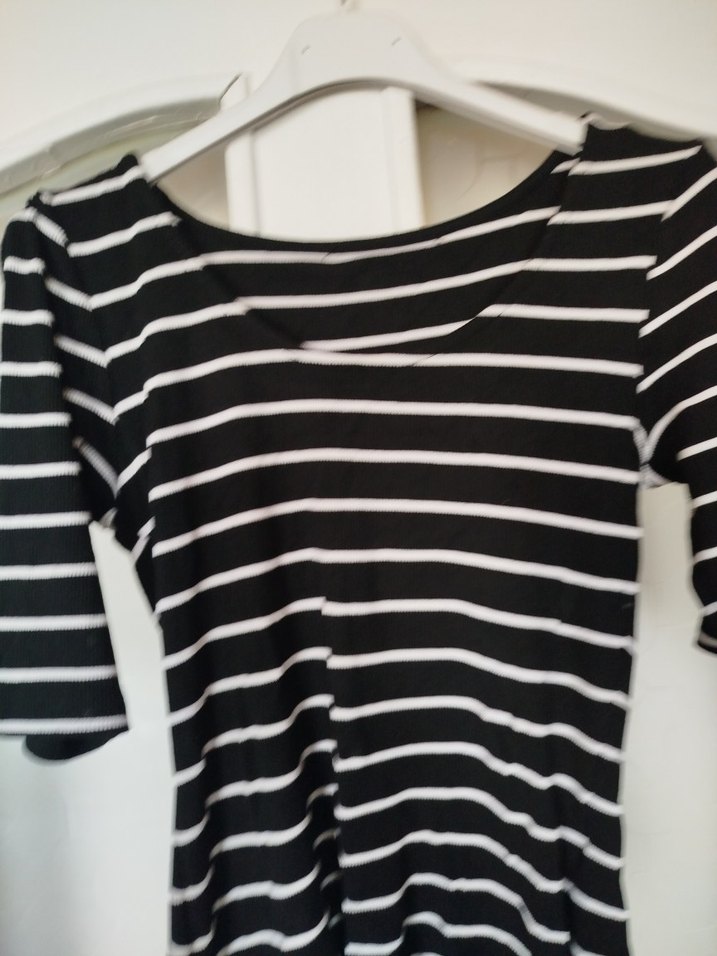 Pamuk kumaştan yapılmış, çizgili, tekne yaka ve kısa kollu, yan yırtmaçlı, normal boyda siyah hamile tişörtü. Günlük kullanıma uygun, rahat ve şık.