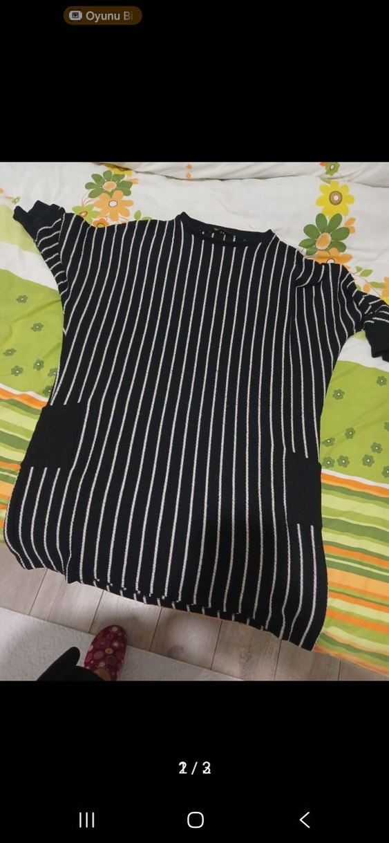 Uzun kollu, bisiklet yaka ve çizgili siyah triko midi elbise. Yumuşak sentetik kumaştan örülüdür ve önünde cepler bulunur. Günlük sokak tarzı için uygundur.