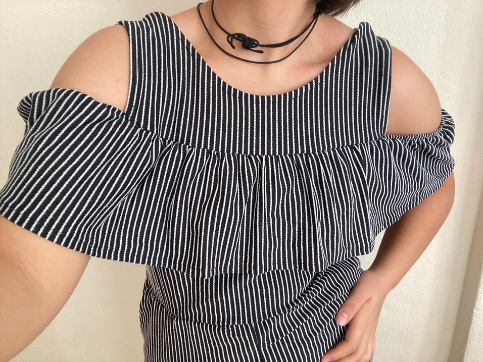 Siyah çizgili, kayık yaka ve askılı kollu tulum. seve seve giydim sıkıldığım için satıyorum.