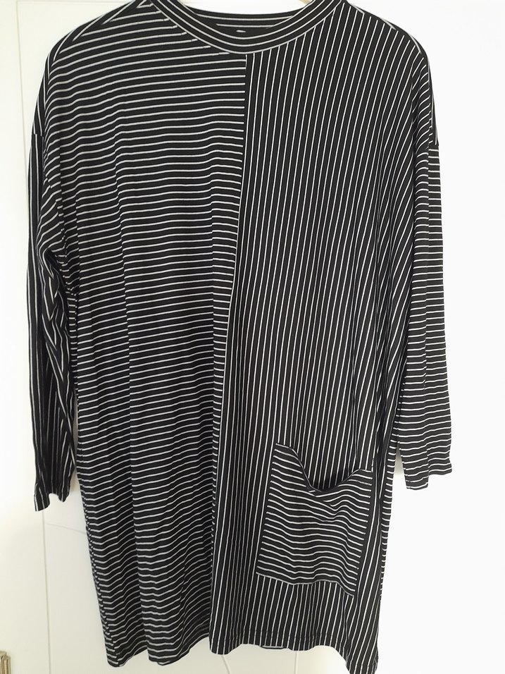 Uzun kollu, salaş kesim siyah tunik. Tekne yakalı ve , çizgili desene sahip. Minimalist sokak stili için uygun, likralı kumaştan yapılmıştır.