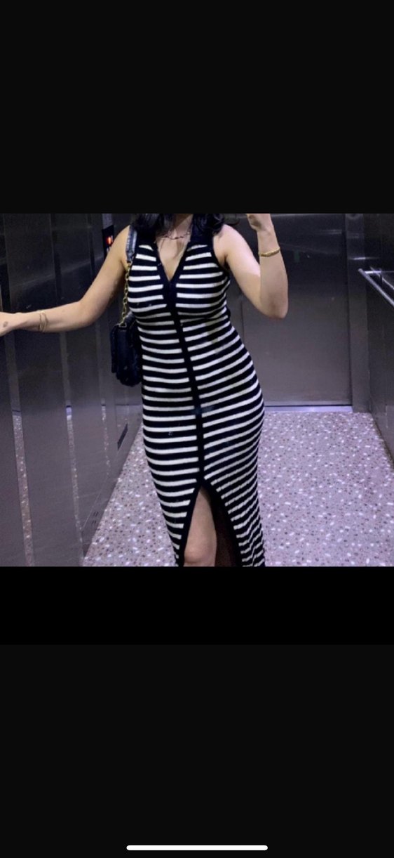 Siyah-beyaz çizgili uzun elbise, ince kesim, V yaka ve askılı kollara sahip. Önde yırtmaç detayı bulunur, sentetik kumaştan üretilmiştir. Sırt dekoltesi de mevcut