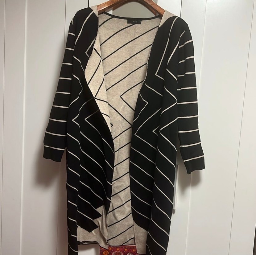 Çizgili desenli, uzun ve siyah renkte, yakası kesimli ve dökümlü tasarıma sahip kadın hırkası. Pamamsı dokulu kumaştan üretilmiş, rahat kesim ve uzun kolludur.