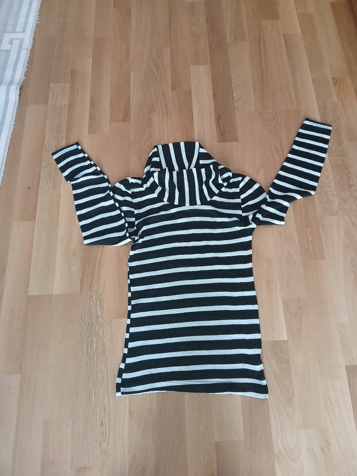 Siyah beyaz çizgili ince kazak. Boğazlı trikosu ince, sorunsuz kazak