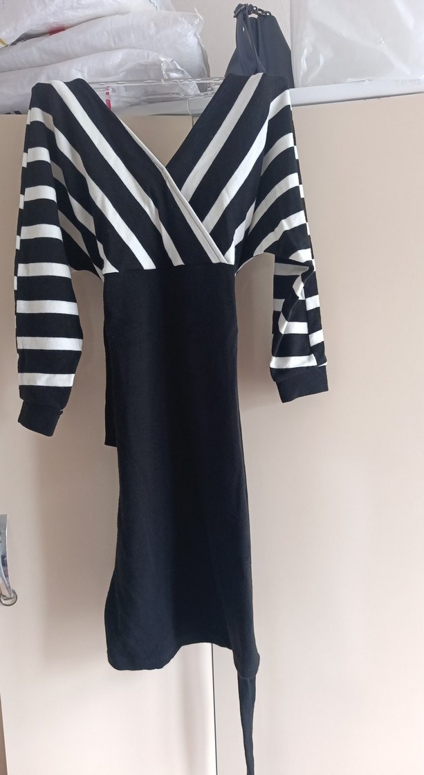 Üst kısmı beyaz çizgili siyah uzun elbise, V yakalı ve drapeli, sentetik kumaştan. Günlük sokak tarzına uygun.