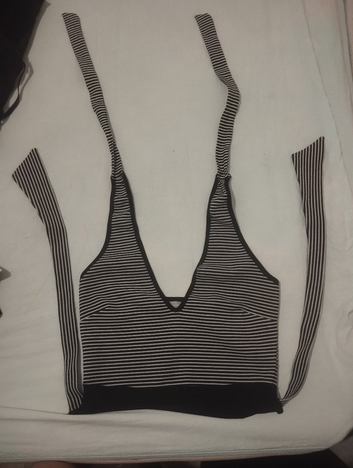 Siyah ve ince çizgili askılı, V yakalı elastik kumaştan yapılmış, vücuda oturan crop top. Sokak modasına uygun bir parça.