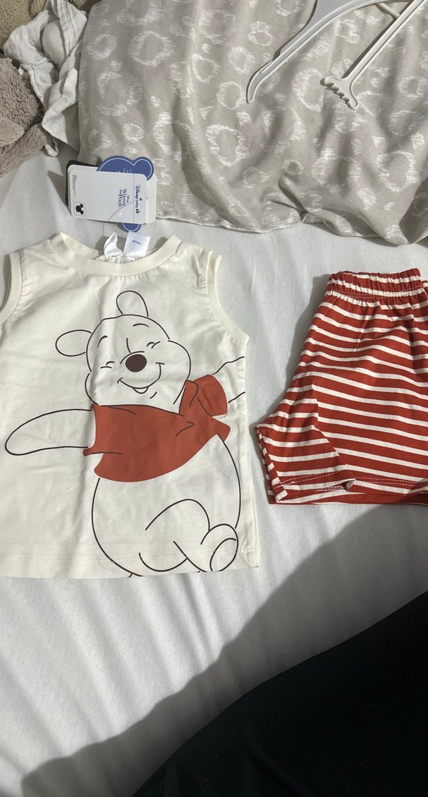 Kolsuz pamuklu bebek takımı, baskılı yuvarlak yaka üst ve çizgili örme şort ile tamamlanmıştır. Hafif ve rahat kullanım sağlar.
