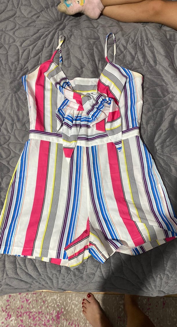 Fitted kesim, pastel renkli çizgili, straplez ve fırfırlı detaylı kadın mini tulum. Sentetik kumaştan üretilmiştir. Parti için uygundur.