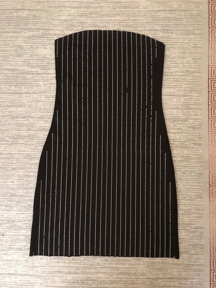 Çizgili, straplez ve pileli tasarıma sahip, vücuda oturan siyah midi elbise. Romantik akşamlar için çağdaş ve avant-garde bir stil sunar. hic giymedim taslari dusmus