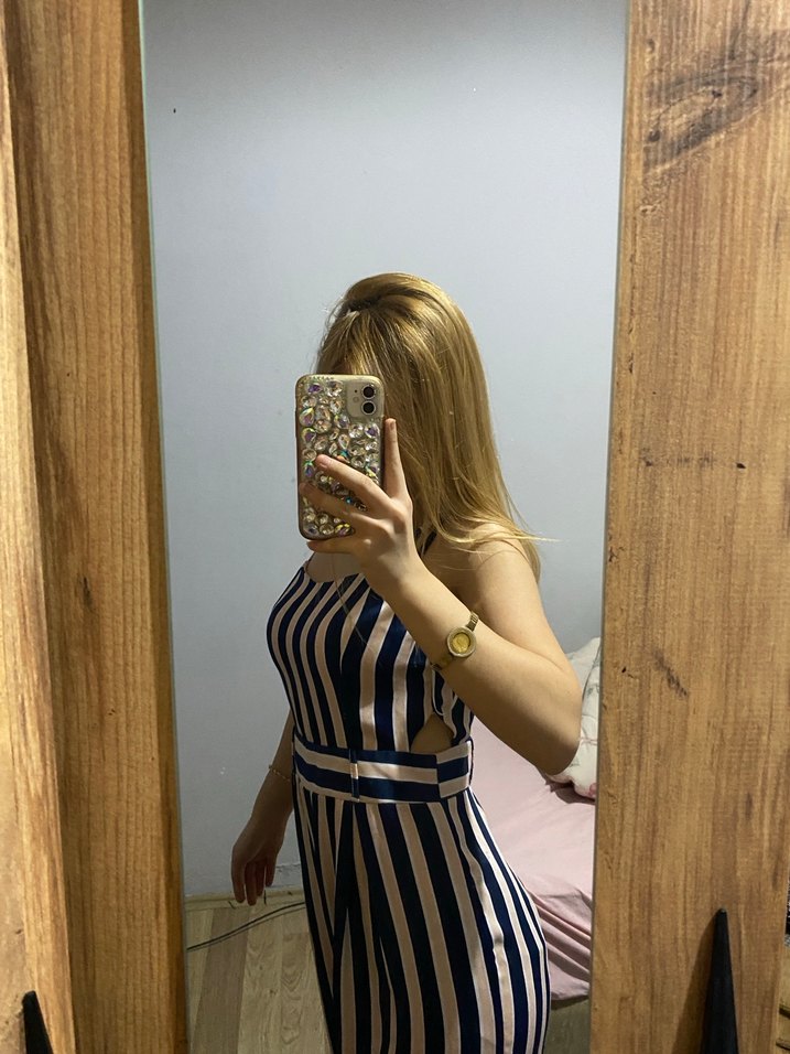 Çizgili, straplez ve dar kesim mini tulum, hafif çok renkli ve şeffaf dokunuşlu sentetik kumaştan. Günlük sokak tarzına uygun.