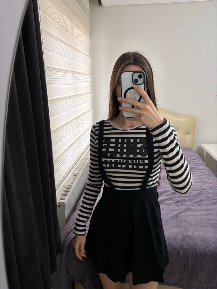 Uzun kollu, çizgili triko üst ve siyah etekten oluşan, straplez yakalı, vücuda oturan midi elbise. Günlük kullanım için Paris tarzı, zahmetsiz şıklık sunar.