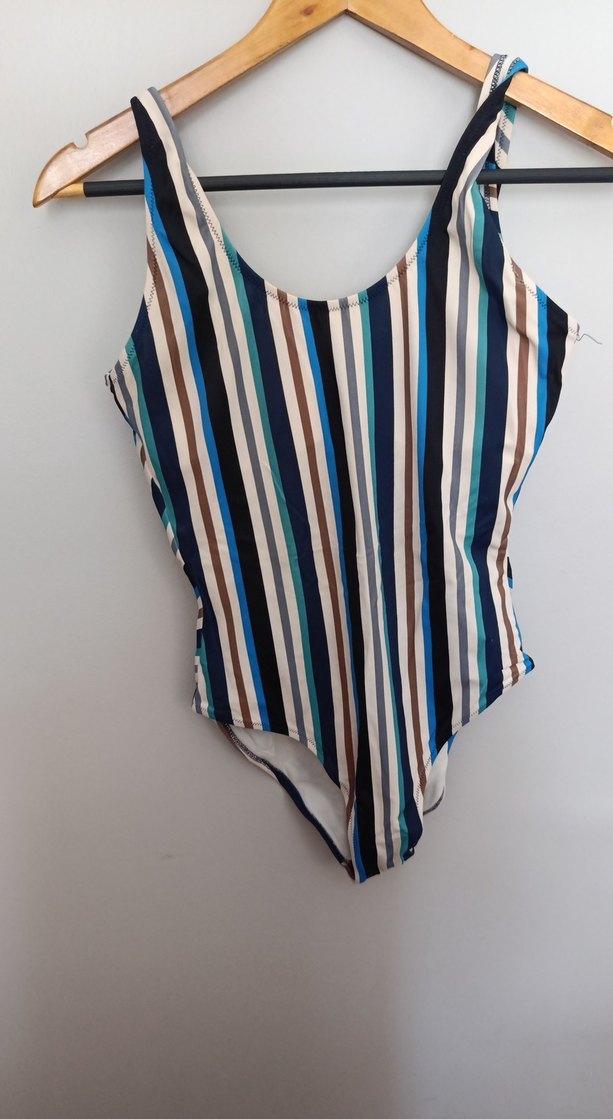 Çizgili, strappy kollu, vücuda oturan kadın mayo. Çok renkli, midi boyda ve bohem tarzda plaj için uygun.